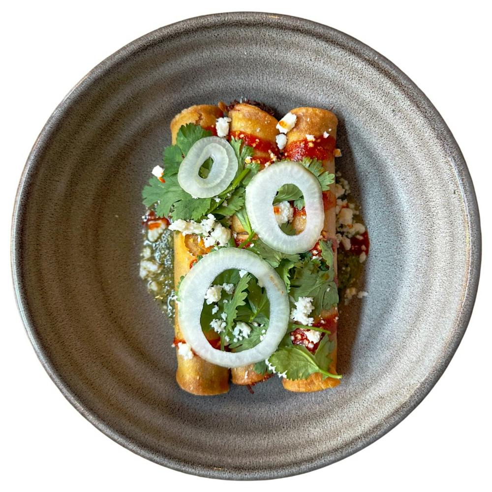 bulgogi marinated brisket and fontina cheese rolled in a corn tortilla, salsa verde, house chili sauce, cilantro, onion, cotija cheese