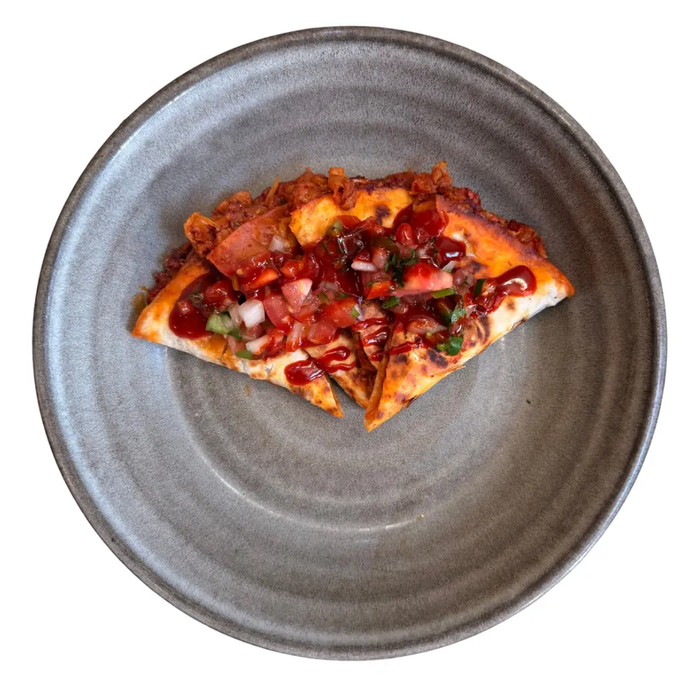 chicken and kimchi quesadilla topped with pico de gallo and mandu hot sauce