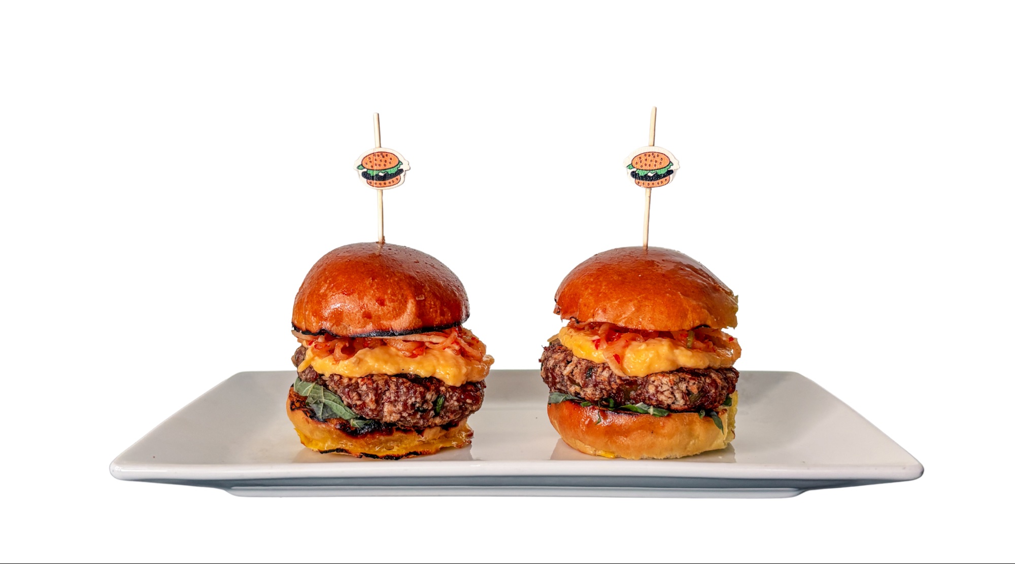 two bulgogi sliders on toasted brioche buns with garlic kimchi toum, perilla, and spicy pickled radish