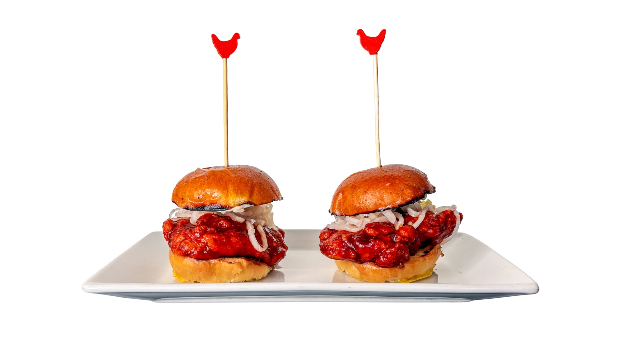 two korean fried chicken sliders in a sweet and spicy soy glaze, toasted brioche buns, kewpie mayo, and pickled radish